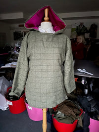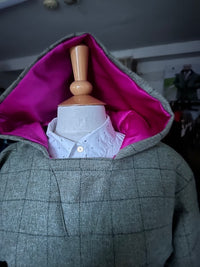 This sage coloured luxury tweed hoodie has a beautiful duchess satin bright pink lining. Unfortunately this tweed is no longer milled so this is the last one remaining.