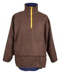 Made from a beautiful brown tweed from Yorkshire, lined with blue fleece and with a contrasting ochre coloured chunky zip. Suede trim to collar to allow for wear.