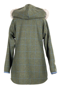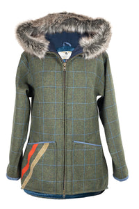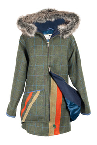 Made with a fantastic sporting tweed from Scotland containing teflon for increased weatherproofing. Lined with moleskin and a petrol blue satin. With a fleece lined faux fur trimmed large hood - this keeps your head cosy but also when the hood is down keeps your neck cosy as well.