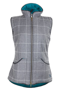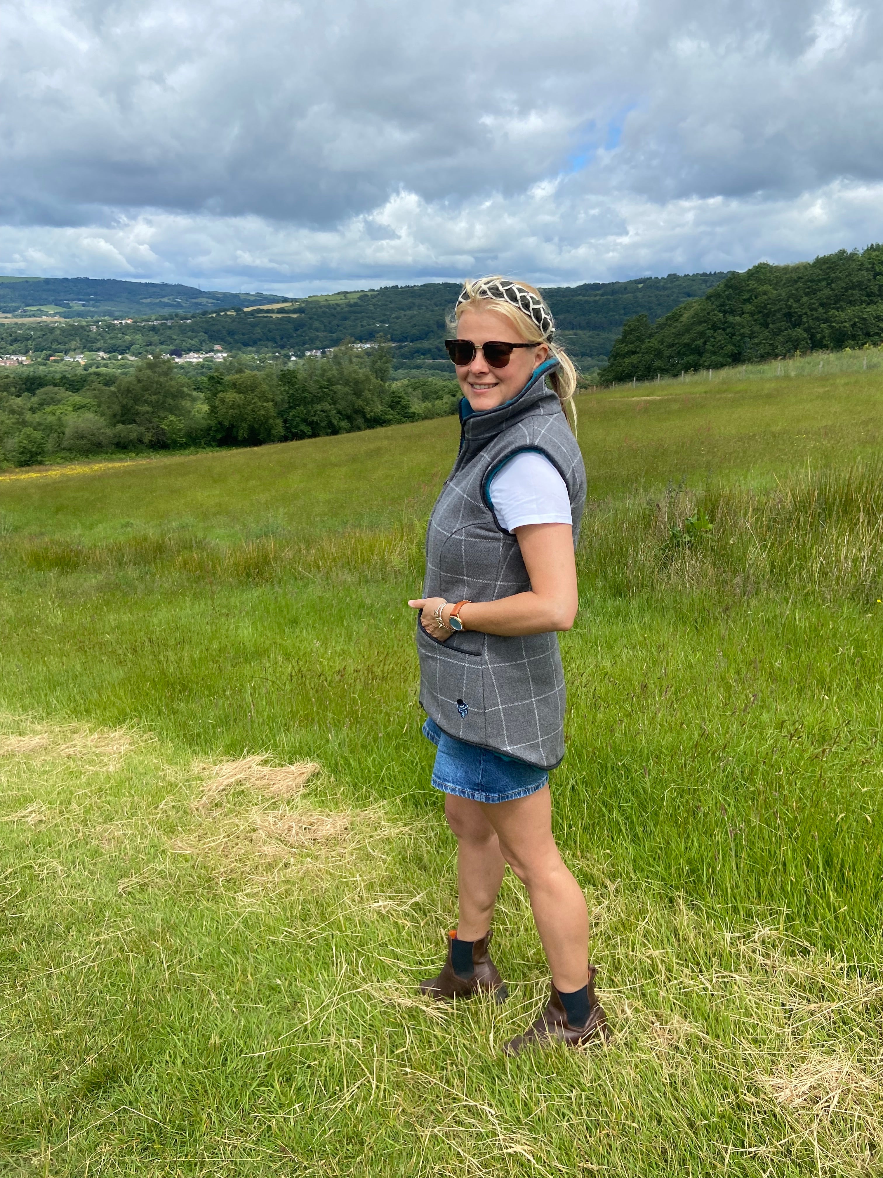 New for Spring from Maude and Fox - the Selkie grey tweed gilet made with a soft and feminine tweed from Scotland with a teal fleece lining.
