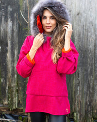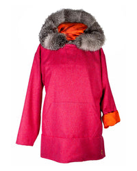 Made from a beautifully soft tweed from Yorkshire this lovely pink tweed has a herringbone weave running through it and drapes beautifully. Teamed with an orange satin lining in a perfect colour combination. The large hood is trimmed with grey faux fur for a glamorous finish. The handy pouch pocket on the front is made in matching tweed.